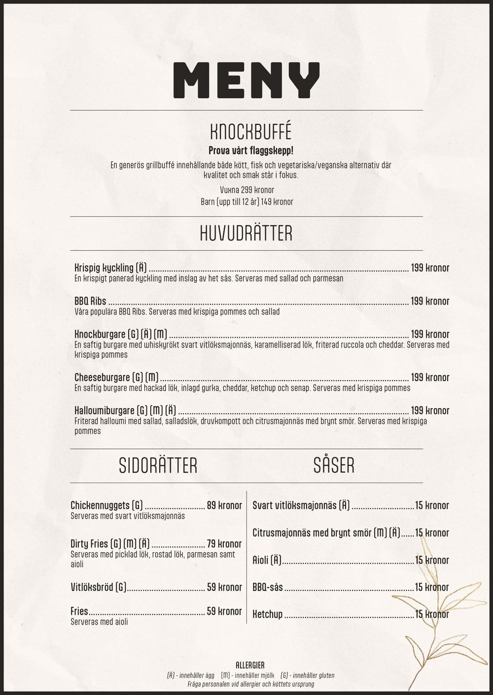 Upptäck Knock-buffén, en generös och smakrik upplevelse som passar alla. I carving station står våra kockar redo med utvalda favoriter som skärs upp direkt på plats, och du får verkligen inte missa det stora efterrättsbordet. Perfekt för en avslappnad middag med familj, vänner eller kollegor.